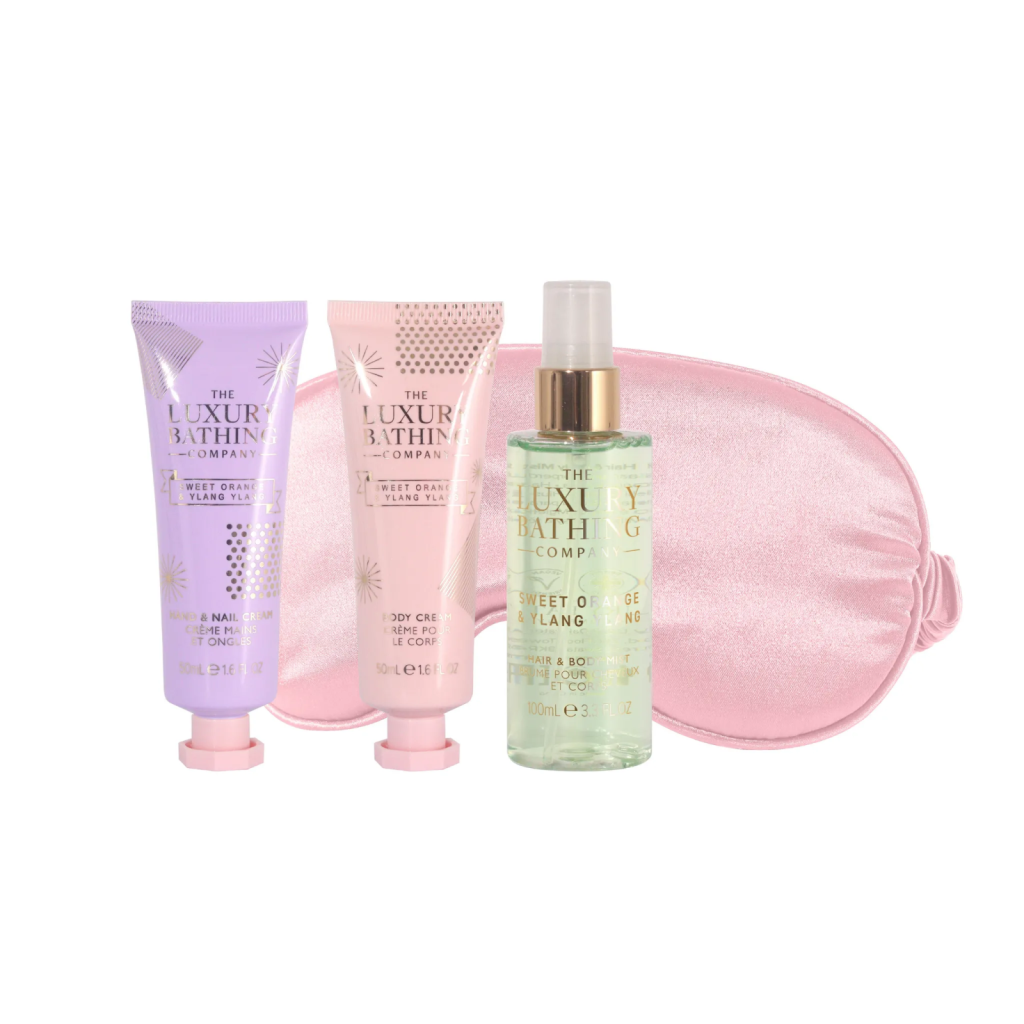 Set cadou Nourishing Delights, Sweet Orange & Ylang Ylang, 100 ml Gel de dus, 50 ml Crema pentru maini si unghii, 50 ml Crema corp & Masca de dormit Luxury pentru ochi, The Luxury Bathing Company
